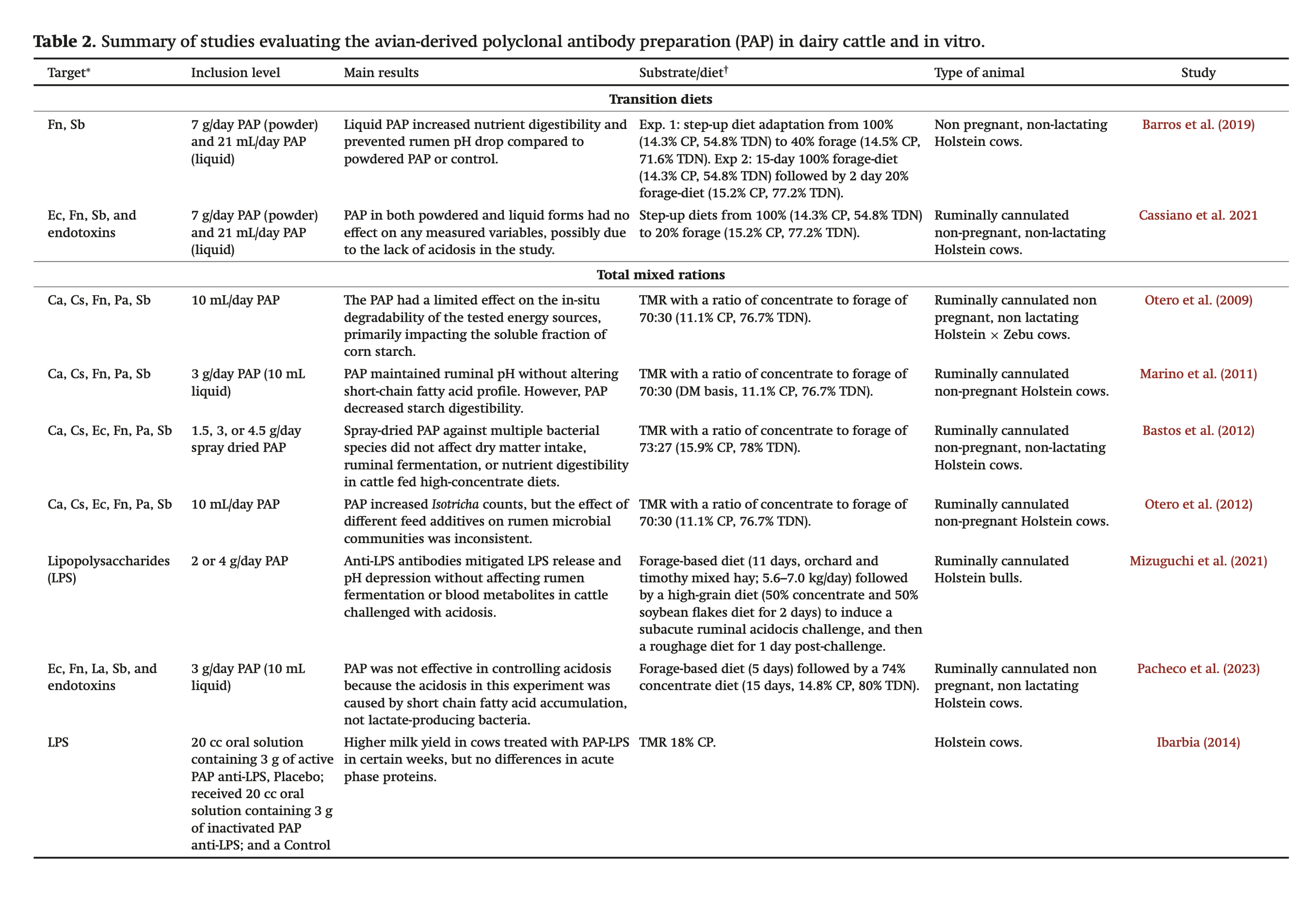 Other studies have explored the use of PAP in dairy cattle to evaluate their effects on rumen function, nutrient digestibility, and the mitigation of metabolic challenges such as acidosis through ruminal pH, with or without the comparison to monensin (Table 2). Similar to the beef cattle studies, the major bacteria targeted were Streptococcus bovis and Fusobacterium necrophorum. Marino et al. (2011) investigated the effects of PAP targeting Streptococcus bovis, Fusobacterium necrophorum, Clostridium aminophilum, Peptostreptococcus anaerobius, and Clostridium sticklandii, compared to monensin, on ruminal fermentation patterns and in vivo digestibility in ruminally cannulated dairy cows. The study found that starch digestibility was negatively impacted in PAP-treated cows compared to both the control and monensin-treated cows. Interestingly, no differences in ruminal pH were observed between monensin and PAP-treated cows; however, both treatments resulted in higher pH levels 4 h post-feeding compared to control cows. In contrast, Pacheco et al. (2023) compared PAP targeting Streptococcus bovis, Lactobacillus spp., Fusobacterium necrophorum, E. coli O157H:7, and endotoxins to monensin and found that cattle treated with monensin exhibited higher mean ruminal pH values compared to those receiving PAP. Barros et al. (2019) testing two forms of PAP–powdered (7 g/day) and liquid (21 mL/day)–targeting Streptococcus bovis, Fusobacterium necrophorum, E. coli, and endotoxins during dietary transition in dairy cattle. When liquid PAP was fed, it improved apparent dry matter and neutral detergent fiber digestibility and effectively prevented a ruminal pH drop compared to both powdered PAP and the control group (Barros et al. 2019). However, Marino et al. (2011) detected a reduction in apparent total tract digestibility of starch for Holstein cows consuming high-grain diets with the addition of PAP at 10 mL/day compared with cows consuming the control treatment (95.3 or 96.8%, respectively). When four doses (0, 1.5, 3, and 4.5 g/day) of spray-dried PAP were formulated against 26% Streptococcus bovis, 12% Fusobacterium necrophorum, 48% against the proteolytic bacteria (Clostridium aminophilum, Peptostreptococcus anaerobius, and Clostridium sticklandii), and 14% E. coli O157:H7 and administered to Holstein cows fed high-concentrate diets, Bastos et al. (2012) did not observe differences in nutrient digestibility. The variability in nutrient digestibility results across experiments suggests that the effectiveness of PAP as a feed additive is influenced by several factors, including dosage (Silva et al. 2022a, 2022b) and its physical form. These findings highlight that animal responses to PAP can vary significantly depending on the diet fed to the animals, the mode of delivery, the preparation and purification of the PAP, and the bacterial species targeted.